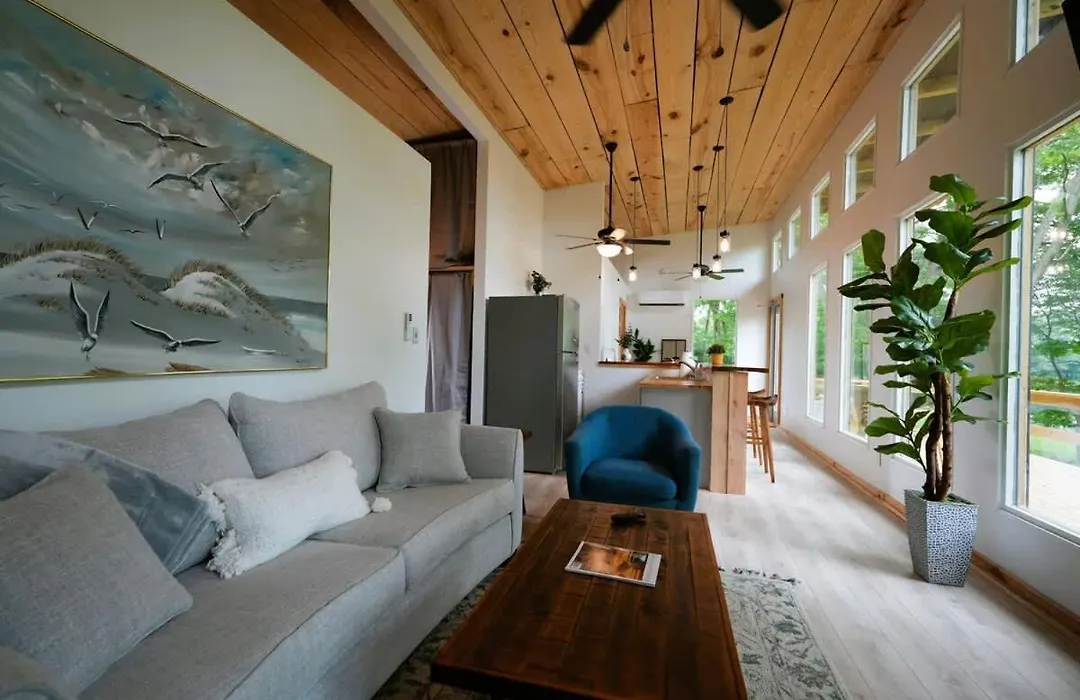 A Luxe 2Br Cabin With Deck And Creek View - Working Farm dispõe de cozinha equipada onde é fornecido refrigerador, forno e utensílios de cozinha.